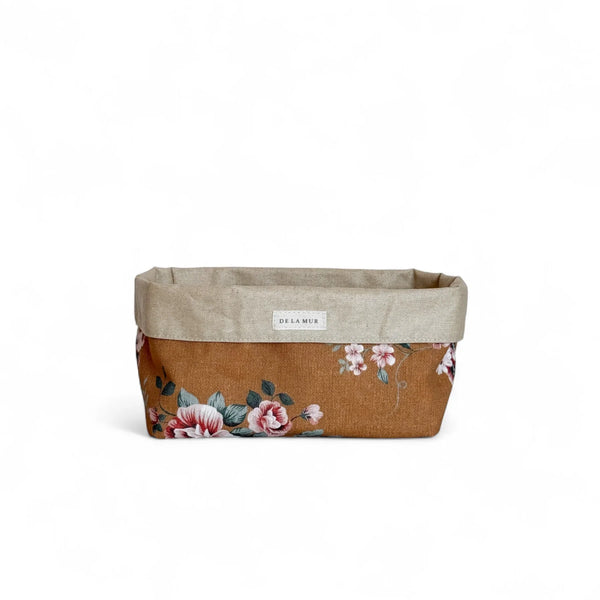 Dit opbergmandje van De La Mur Line is gemaakt van een half-panama stof met een boemenprint op een oranjebruine achtergrond. De binnenkant is afgewerkt met een gecoate laag die gemakkelijk schoon te maken is.