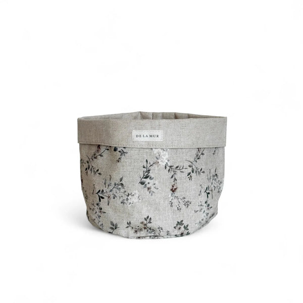 Dit opbergmandje van De La Mur Line is gemaakt van een half-panama stof met een bloemenprint op een grijsachtige achtergrond. De binnenkant is afgewerkt met een gecoate laag die gemakkelijk schoon te maken is.