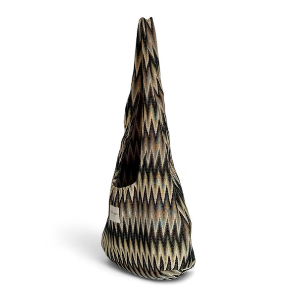 Deze unieke ovale shopper van de La Mur Line, ook wel bekend als halve maan shopper, is uitgevoerd in een dikke jacquardstof met een zigzagpatroon in aardse kleuren als beige, bruin, zand en zwart.