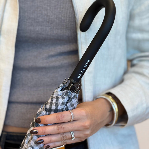 Deze elegante paraplu van De La Mur Line is uitgevoerd in een zwart- en beige ruitjespatroon. Ontworpen in dezelfde print als onze tassen en accessoires, zodat je altijd perfect gestyled de deur uitgaat, ook als het regent.