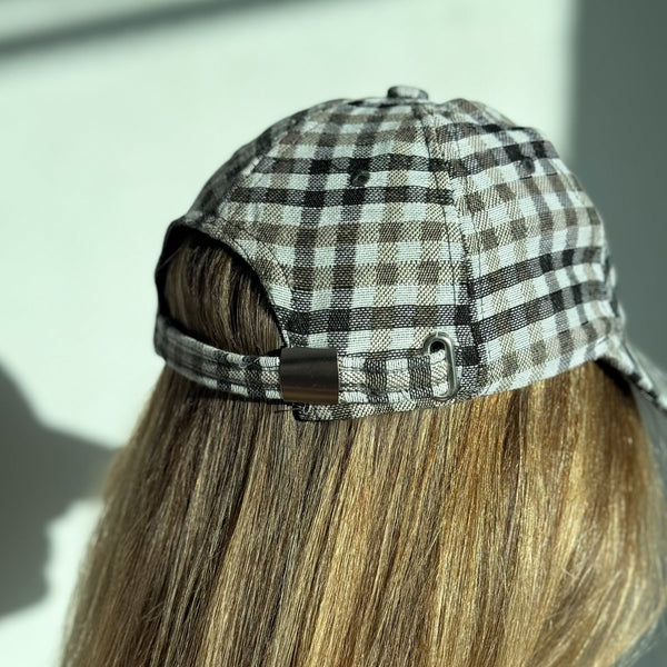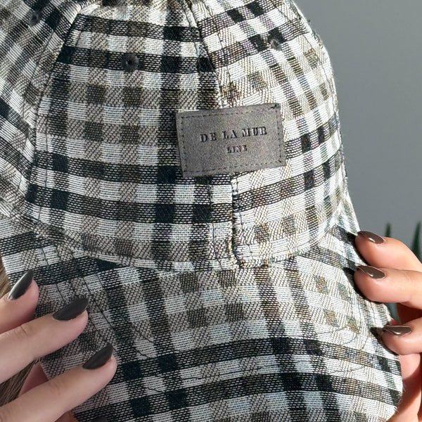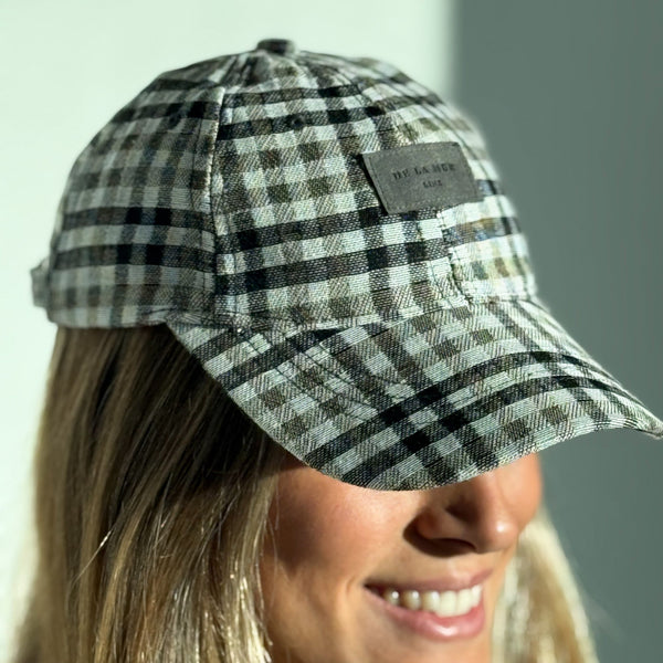Deze karaktervolle pet van De La Mur Line is uitgevoerd in een zwart-beige ruitpatroon.