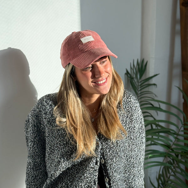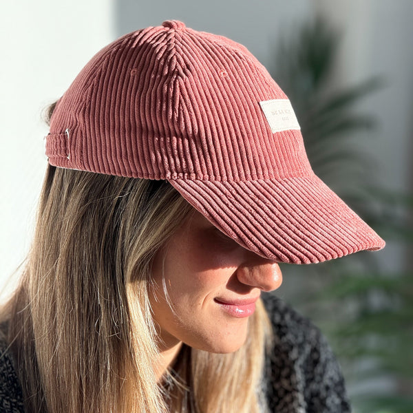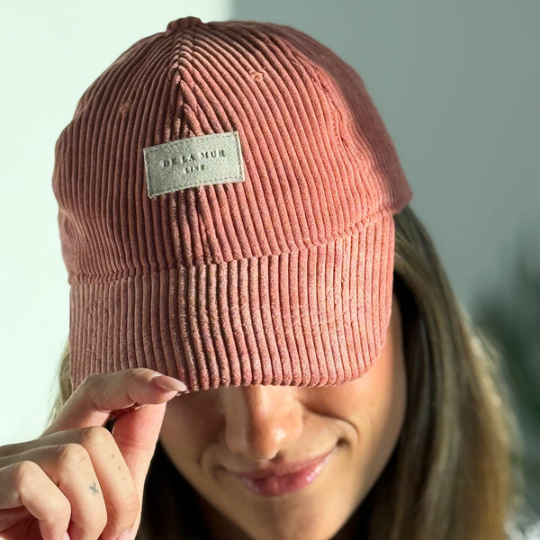 Deze karaktervolle pet van De La Mur Line is uitgevoerd in koraalkleurige corduroy ribstof met een camelkleurig label.