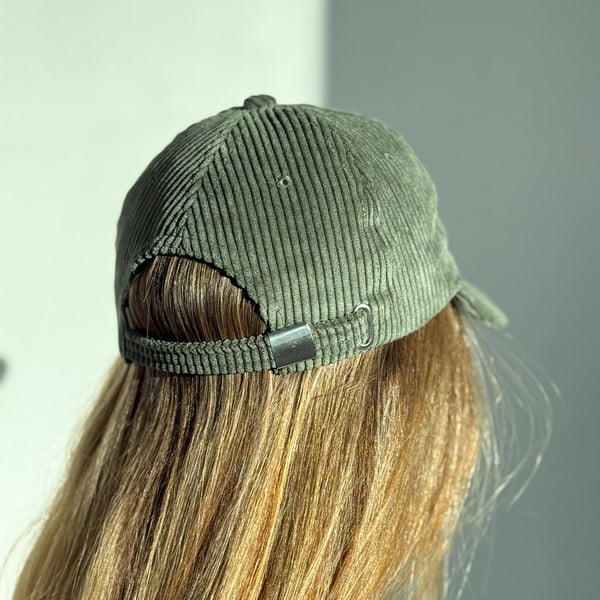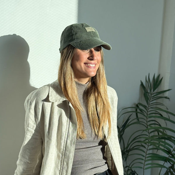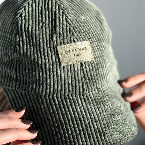 Deze karaktervolle pet van De La Mur Line is uitgevoerd in donkergroene corduroy ribstof met een groen label.