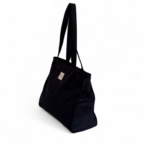 Deze rechthoekige Shopper van De La Mur Line is uitgevoerd in een dikke zwarte fluwelen stof.