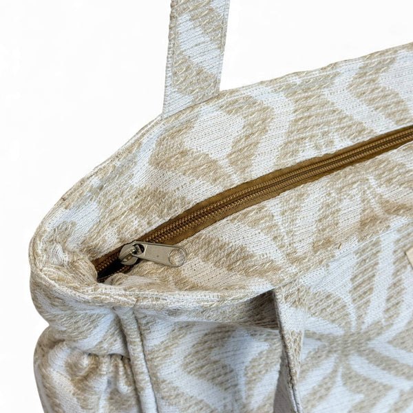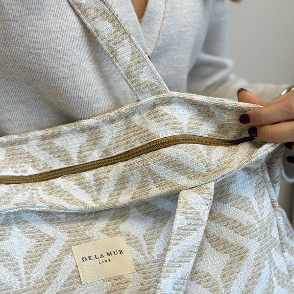 Deze rechthoekige Shopper met rits van De La Mur Line is uitgevoerd in jacquardstof met een verfijnde geometrische print in zand- en crèmetinten.