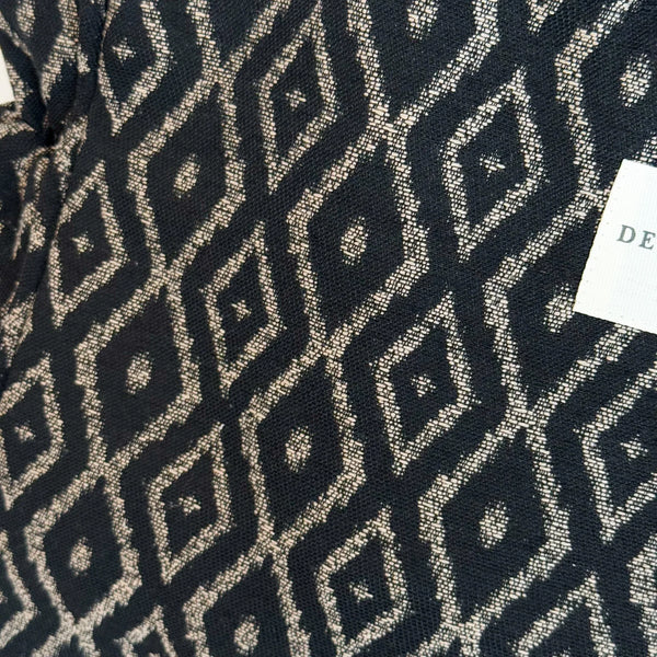 Deze rechthoekige Shopper van De La Mur Line is uitgevoerd in een dikke jacquardstof met een beige, grafisch ruitpatroon op een diepzwarte achtergrond.