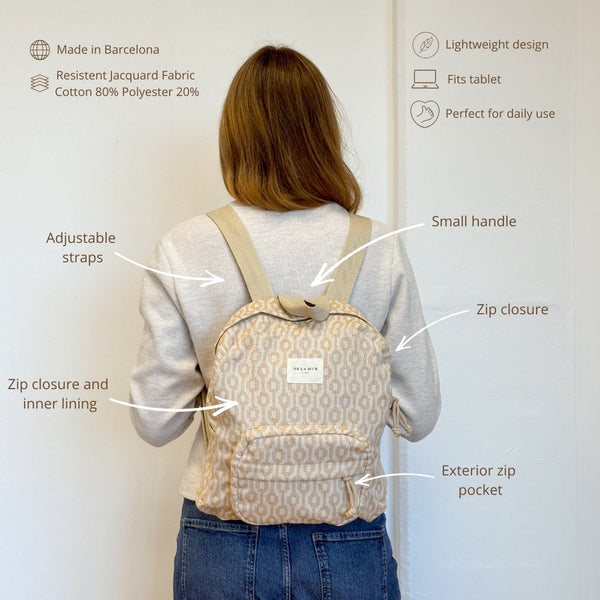 Deze stijlvolle rugzak van De La Mur Line is uitgevoerd in camelkleurige jacquardstof met een verfijnde geometrische print in crème.