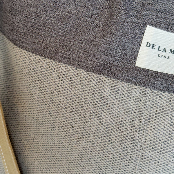 Deze grote schoudertas van de La Mur Line is gemaakt een dikke taupekleurige meubelstof aan de bovenkant en een stevige, effen beige meubelstof aan de onderkant.