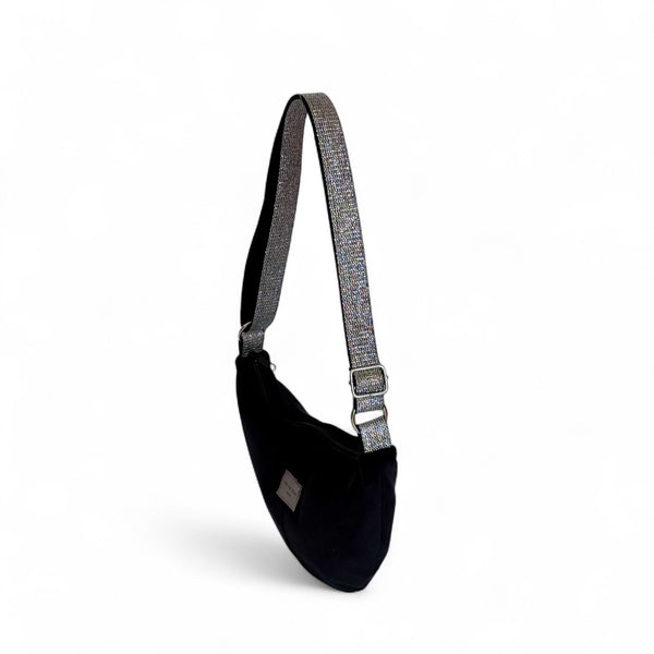 De lange, verstelbare schouderband van zwart katoen heeft aan één zijde een zilverkleurige lurex (glitter) voor een feestelijk accent. Je draagt de tas crossbody of stijlvol over de schouder - een chique finishing touch voor je outfit.