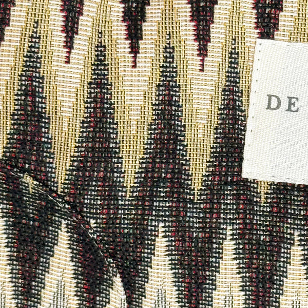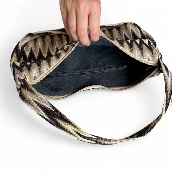 Deze kleine schoudertas van de La Mur Line is uitgevoerd in een dikke jacquardstof met een zigzagpatroon in aardse kleuren als beige, bruin, zand en zwart.
