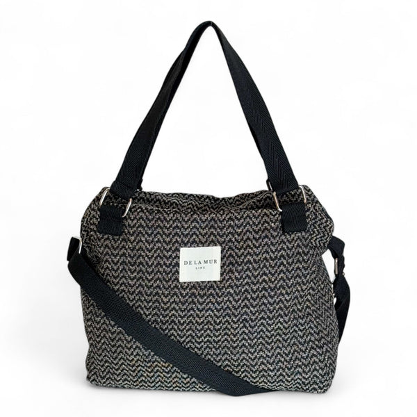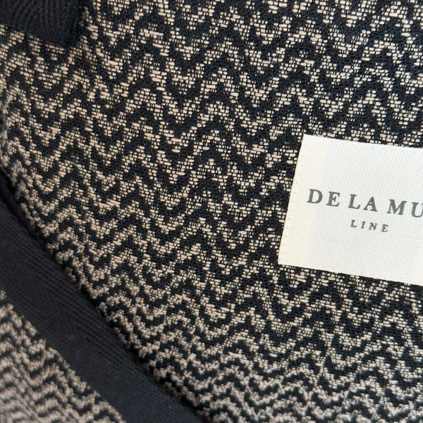 Deze schoudertas Maletin van de La Mur Line, ook wel de compacte en stijlvolle aktetas genoemd, is een prachtige middelgrote tas uitgevoerd in een dikke jacquardstof met een zigzagpatroon in zwart en beige.