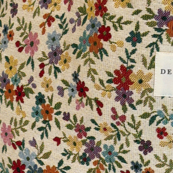 Deze grote shopper van De La Mur Line is uitgevoerd in een dikke jacquard stof met een meerkleurige bloemenprint op een beige achtergrond.