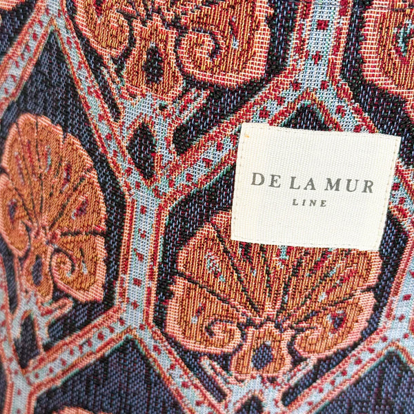 Deze grote shopper van De La Mur Line is uitgevoerd in een dikke jacquardstof met een koperkleurig bloemmotief op een diepblauwe achtergrond.