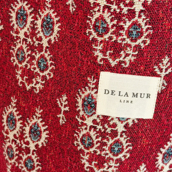 Deze grote shopper van De La Mur Line is uitgevoerd in een dikke jacquardstof met een klassiek patroon op een wijnrode achtergrond.