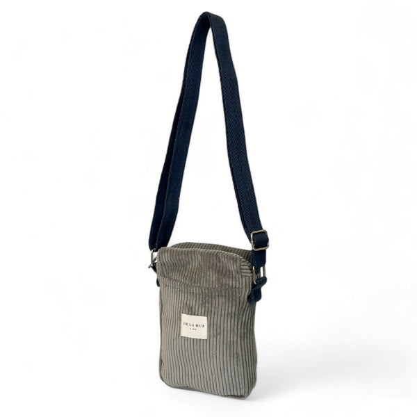 Dit leuke en compacte telefoontasje van de La Mur Line is uitgevoerd in een grijze corduroy ribstof.