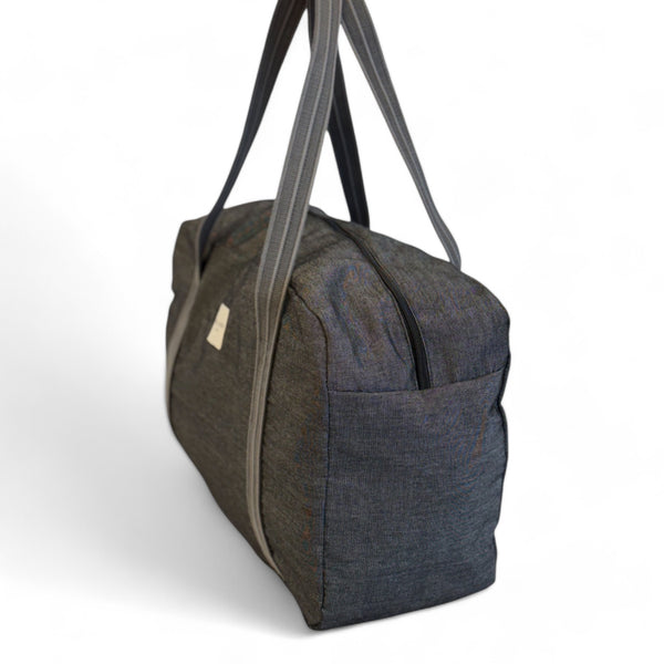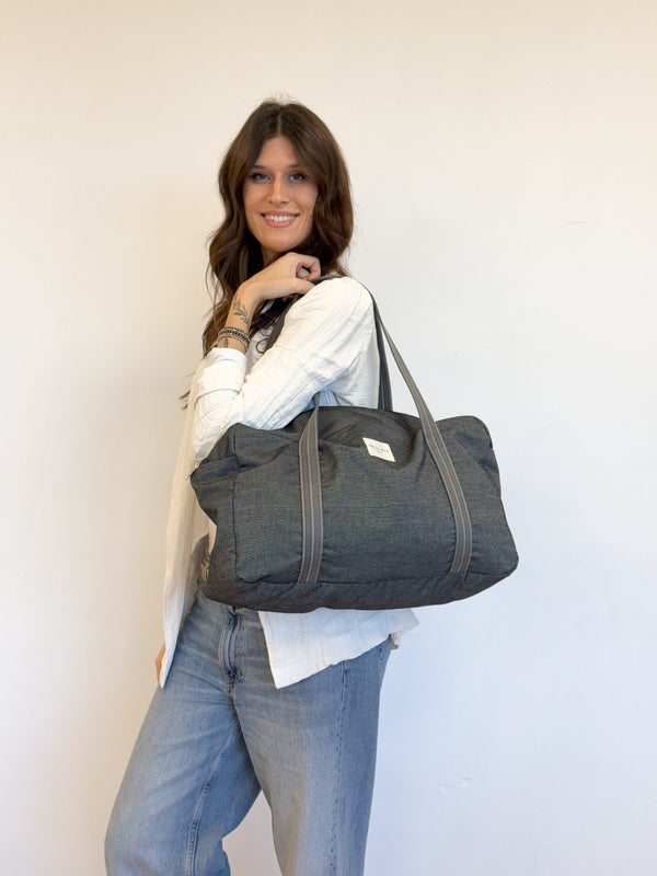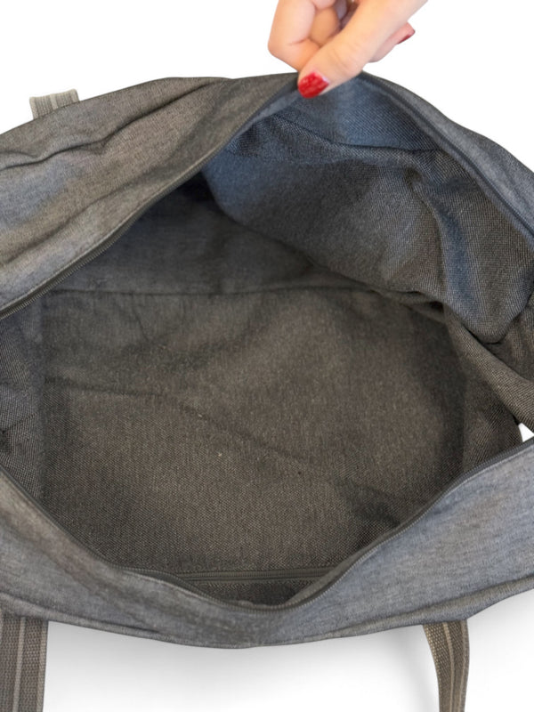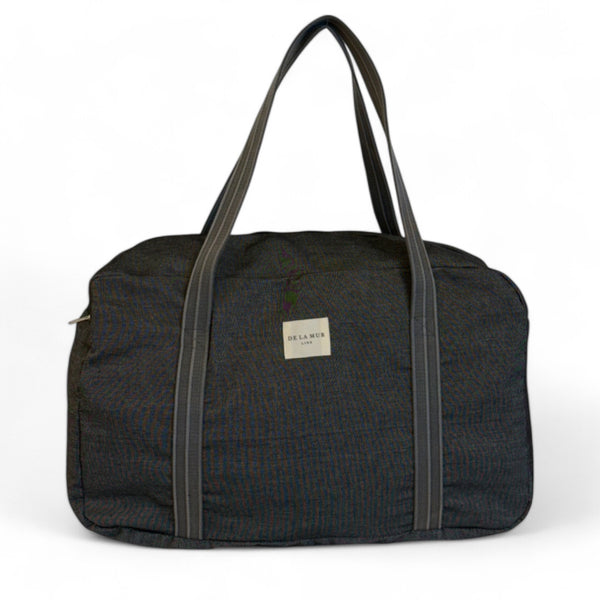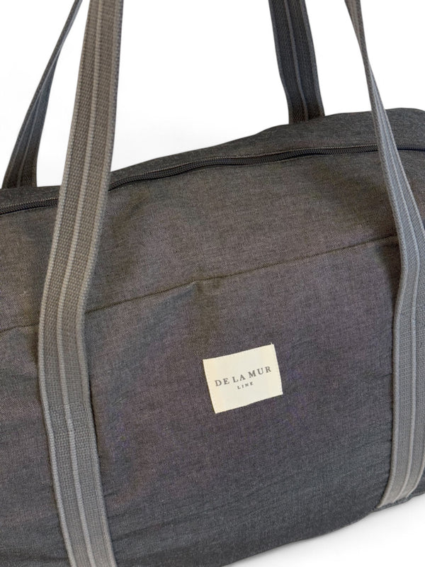 Deze stevige en ruime sporttas van de La Mur Line, ook wel duffeltas of duffle bag genoemd, is uitgevoerd in een dikke, effen donkergrijze stof.