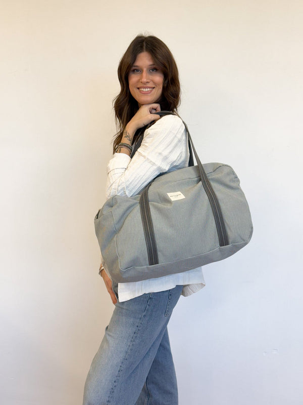 Deze stevige en ruime sporttas van de La Mur Line, ook wel duffeltas of duffle bag genoemd, is uitgevoerd in een dikke effen grijsgroene stof.