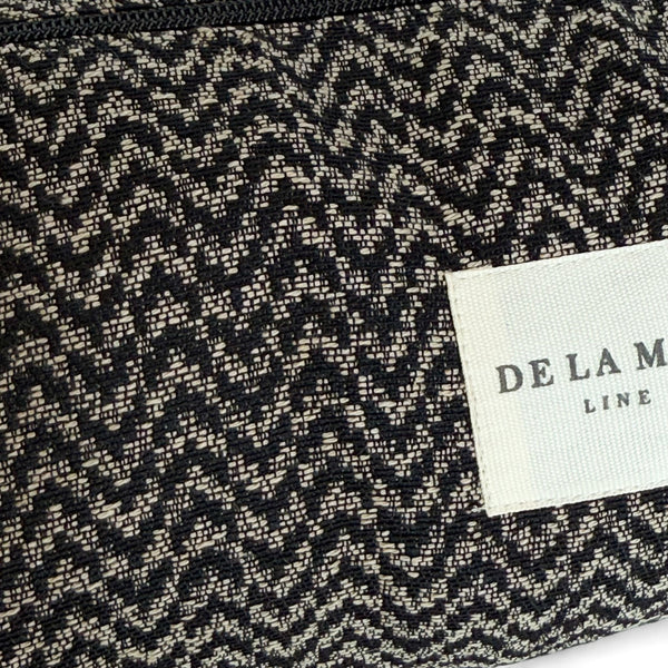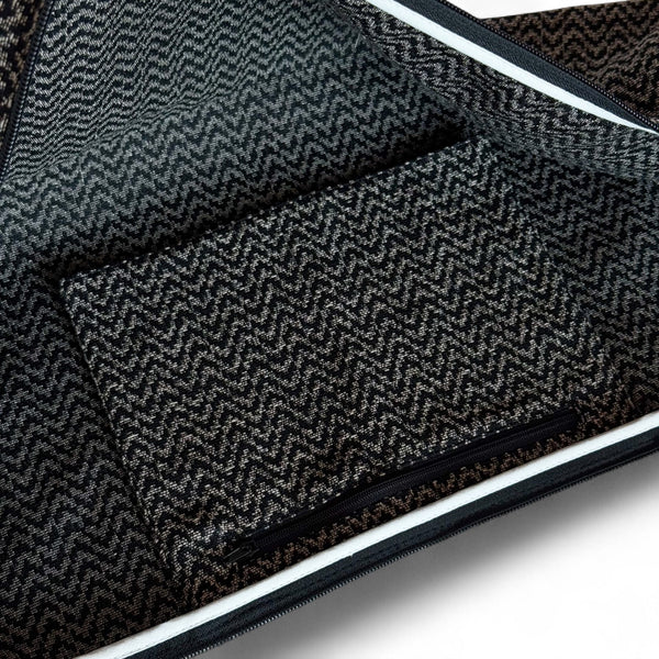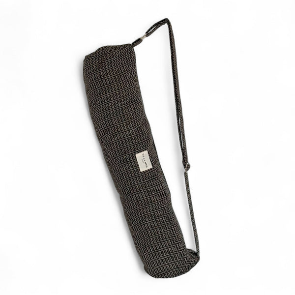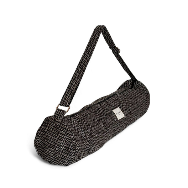 Deze yogamat tas van de La Mur Line is uitgevoerd in een dikke jacquardstof met een zigzagpatroon in zwart en beige.